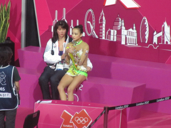 곤봉 연기 실수 직후 손연재와 옐레나 니표도바 코치가 초조한 표정으로 점수 발표를 기다리고 있다.
