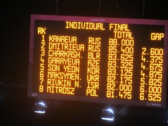 11일 오후 9시30분 런던 웸블리아레나에서 펼쳐진 런던올림픽 리듬체조 개인전 결선에서 손연재는 3종목 합계 56.375점(후프 28.050점, 볼 28.325점, 곤봉 26.750점)을 받으며 10명의 파이널리스트 중 4위를 달리고 있다. 후프-볼 두 종목에서 최고의 컨디션으로 완벽한 연기를 선보이며 3위를 달렸던 손연재는 3번째 종목 곤봉에서 초반 수구를 놓치는 실수가 뼈아팠다. 예브게니아 카나예바, 다리아 드미트리예바(이상 러시아), 리우부 차카시나(벨라루스), 알리야 가라예바(아제르바이젠) 등에 이어 5위로 순위가 떨어졌다. 그러나 차카시나, 가라예바와의 점수차는 불과 각각 0.5점, 0.2점에 불과하다. 손연재가 올시즌 가장 강력했던 종목 리본 한 종목을 남겨두고 있다. 리본에서 완벽한 연기를 펼칠 경우 메달권도 바라볼 수 있다. 리듬체조 결선 경기는 후프-볼-곤봉-리본의 순으로 진행된다. 10명 파이널리스트의 4종목 합산점수로 메달색을 가린다. 리본에서 4번째로 나서 런던올림픽 포디움에서 마지막 혼신의 연기를 펼친다. 런던=전영지 기자 sky4us@sportschosun.com