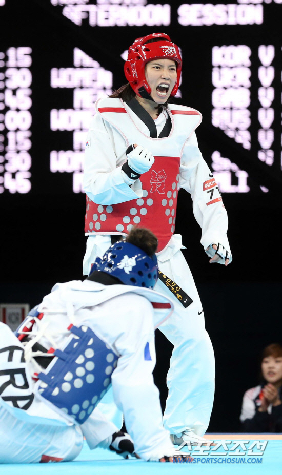 이인종이 11일(현지시간) 영국 런던의 엑셀런던 사우스아레나에서 열린 2012 런던올림픽 여자 67㎏초과급 8강에서 안느-캐롤라인 그라페(프랑스)에게 4-7로 패했다. 경기중 이인종이 공격을 성공한후 기뻐하고있다.