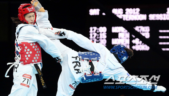 이인종이 11일(현지시간) 영국 런던의 엑셀런던 사우스아레나에서 열린 2012 런던올림픽 여자 67㎏초과급 8강에서 안느-캐롤라인 그라페(프랑스)에게 4-7로 패했다. 경기중 이인종이 공격을 당해 실점하고 있다