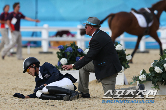 런던올림픽 남자 근대5종에 출전한 한국의 황우진이 11일 오후(현지시각) 런던 그리니치 파크에서 열린 승마 경기에서 말 오스카가 흥분해 낙마해 쓰러져 있다. 승마는 12개의 장애물을 정해진 시간 안에 뛰어넘는 기술을 겨루는 종목이다. 근대5종은 펜싱, 수영, 승마, 달리기와 사격 복합경기를 하루 만에 치뤄 순위를 가린다.
