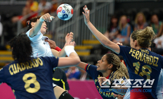 11일 오후 영국 런던 올림픽파크 바스켓볼 아레나에서 열린 2012 런던올림픽 여자 핸드볼 3,4위전 한국와 스페인의 경기에서 정지해 선수가 슛을 하고 있다./20120811런던=올림픽사진공동취재단g