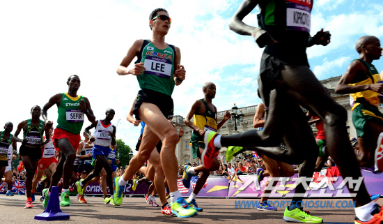 12일 런던올림픽 마지막날 남자 마라톤대회가 런던 시내에서 열렸다. 마라톤에 출전한 각국 대표 선수들이 버킹엄궁전 앞을 힘차게 내달리고 있다. 마라톤 대표 이두행이 각국 선수들과 함께 달리고 있다.