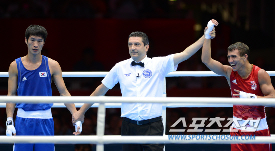 2012 런던올림픽 복싱대표팀의 한순철이 12일(현지시간) 영국 런던의 엑셀 노스아레나에서 열린 남자 복싱 라이트급(60kg) 결승에서 우크라이나의 바실 로마첸코와 대결해 패한 뒤 아쉬움을 삼키고 있다.