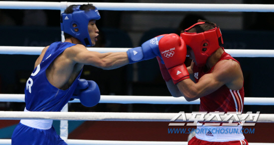 한순철이 12일 엑셀런던 복싱경기장에서 열린 라이트급 결승에서 우크라이나의 바실 로마첸코로를 져 은메달을 따는데 만족해야 했다. 한순철 선수가 로마첸코를 공격하고 있다. 20120812. 런던=올림픽사진공동취재단b