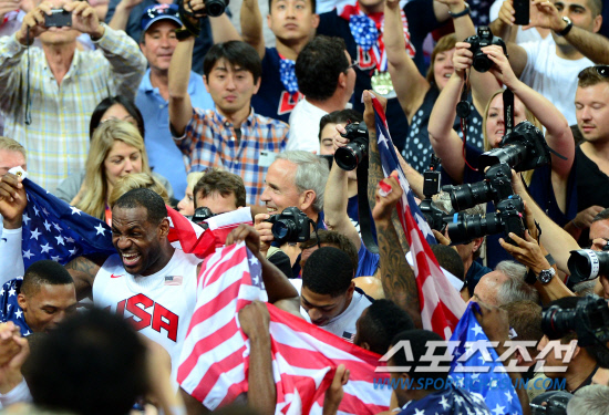 미국 남자 농구 드림팀이 금메달을 획득하며 올림픽 2연패를 달성했다. 12일 런던 노우스 그린위치 아레나에서 열린 스페인과 결승전에서 미국은 스페인에 107-100으로 승리하며 금메달을 따냈다. 승리가 확정되자 르브론 제임스가 성조기를 들고 우승 세리머니를 펼치고 있다.