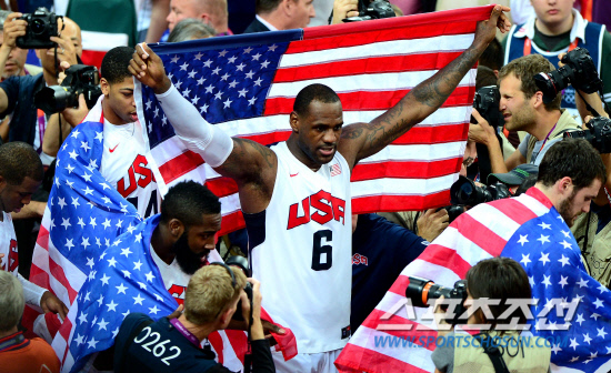 미국 남자 농구 드림팀이 금메달을 획득하며 올림픽 2연패를 달성했다. 12일 런던 노우스 그린위치 아레나에서 열린 스페인과 결승전에서 미국은 스페인에 107-100으로 승리하며 금메달을 따냈다. 승리가 확정되자 르브론 제임스가 성조기를 들고 우승 세리머니를 펼치고 있다.