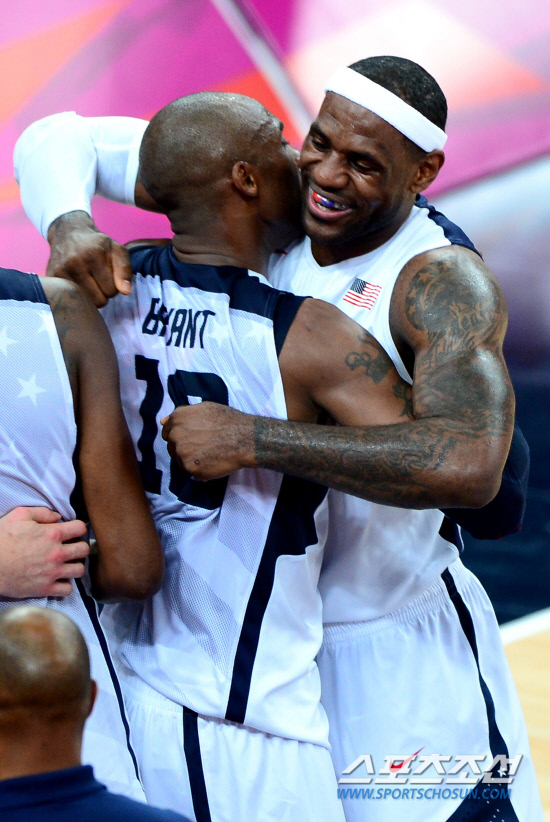 미국 남자 농구 드림팀이 금메달을 획득하며 올림픽 2연패를 달성했다. 12일 런던 노우스 그린위치 아레나에서 열린 스페인과 결승전에서 미국은 스페인에 107-100으로 승리하며 금메달을 따냈다. 르브론 제임스(오른쪽)가 승리가 확정되자 코비 브라이언트와 포옹을 나누고 있다.