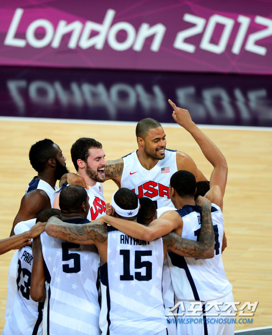 미국 남자 농구 드림팀이 금메달을 획득하며 올림픽 2연패를 달성했다. 12일 런던 노우스 그린위치 아레나에서 열린 스페인과 결승전에서 미국은 스페인에 107-100으로 승리하며 금메달을 따냈다. 승리가 확정되자 미국 선수들이 코트에 나와 환호하고 있다.