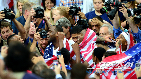 미국 남자 농구 드림팀이 금메달을 획득하며 올림픽 2연패를 달성했다. 12일 런던 노우스 그린위치 아레나에서 열린 스페인과 결승전에서 미국은 스페인에 107-100으로 승리하며 금메달을 따냈다. 승리가 확정되자 르브론 제임스가 성조기를 들고 우승 세리머니를 펼치고 있다.
