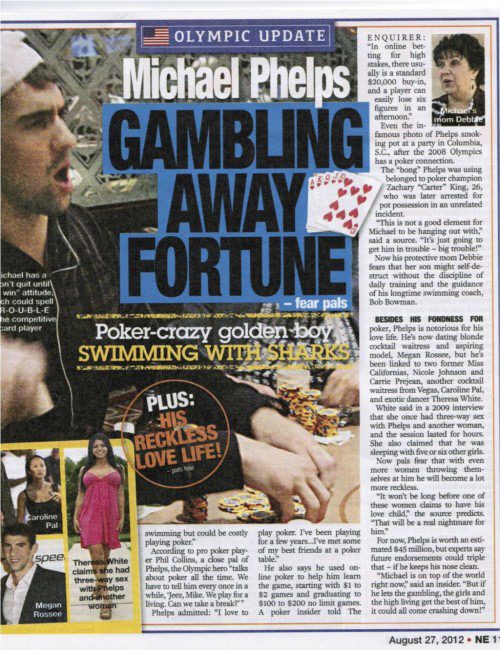 미국 타블로이드 내셔널 인콰이어러는 펠프스 친구들의 말을 인용해 "펠프스가 포커 등 도박으로 이미 적지 않은 재산을 날렸다"면서 "(런던올림픽 이후) 은퇴를 발표했기 때문에 더욱 큰 돈을 날릴 가능성이 높다"고 22일(한국시각) 1면 보도했다.