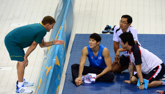 수영 남자 자유형 400m 금메달 2연패에 도전하는 박태환이 23일 오전(현지시간) 런던 올림픽파크 아쿠아틱 센터에서 현지 적응 훈련도중 마이클 볼 코치와 얘기를 나누고 있다. 20120723런던=올림픽사진공동취재단f