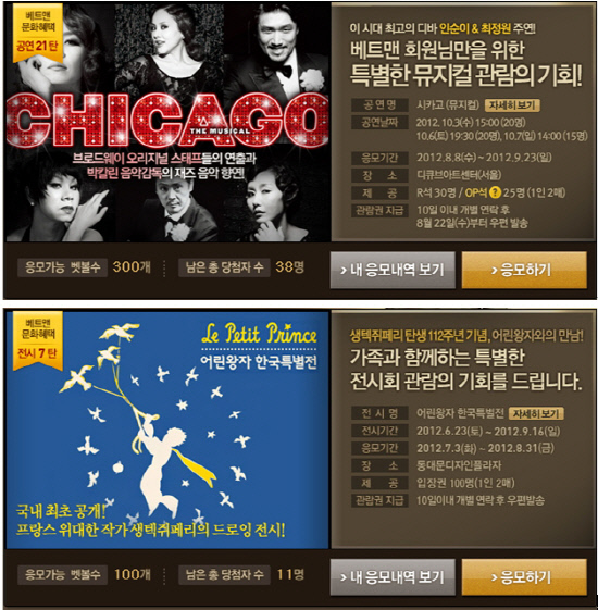 이와 함께 9월 16일까지 동대문 디자인플라자에서 열리는 '어린왕자 한국특별전'티켓을 제공하는 문화혜택 전시 7탄 이벤트가 동시에 진행된다. 프랑스의 작가 생텍쥐페리의 드로잉을 국내 최초로 공개하는 이번 전시회는 어른과 아이 모두가 감동할 수 있는 특별한 기회가 될 것으로 기대를 모으고 있다. 8월 31일까지 벳볼 100개 이상을 보유한 회원은 누구나 응모가 가능하며 추첨을 통해 선정된 100명에게 입장권(1인 2매)을 제공한다.