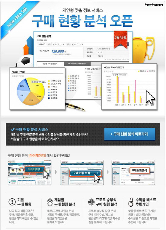 지난 1일 첫 선을 보인 이 서비스는 베트맨 회원이 일정 기간 동안 구매한 토토, 프로토 게임의 적중현황을 상세히 분석해 그래프 형태로 보기 쉽게 제공한다. 구매현황 분석 서비스는 기본 구매현황 분석·게임별 구매현황 분석·프로토 승부식 구매현황 분석·수익률 베스트 추천게임 등 네 가지 메뉴로 구성되어 있다.