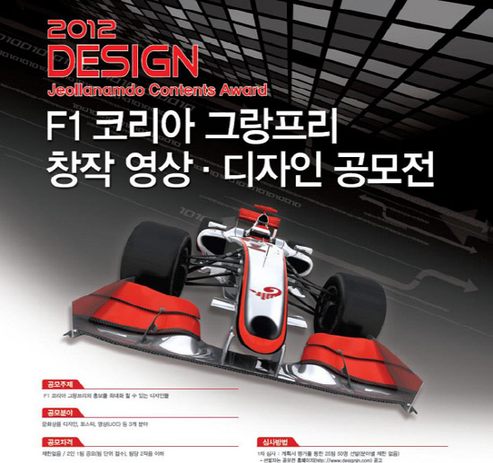 (재)전남문화산업진흥원(원장 김영주)은 '2012 코리아 그랑프리'에 대한 국민적 관심과 참여를 높이기 위해 'F1 코리아 그랑프리 창작 영상디자인 공모전'을 개최한다.