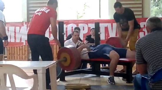 파워리프팅의 세 가지 타입 가운데 누워서 하는 벤치프레스 경기. 185kg에 도전한 골루슈킨은 바벨을 들어 올리다 힘에 부쳐 놓치고 말았다. 어마어마한 무게가 가슴 부분에 엄청난 충격을 가했다.