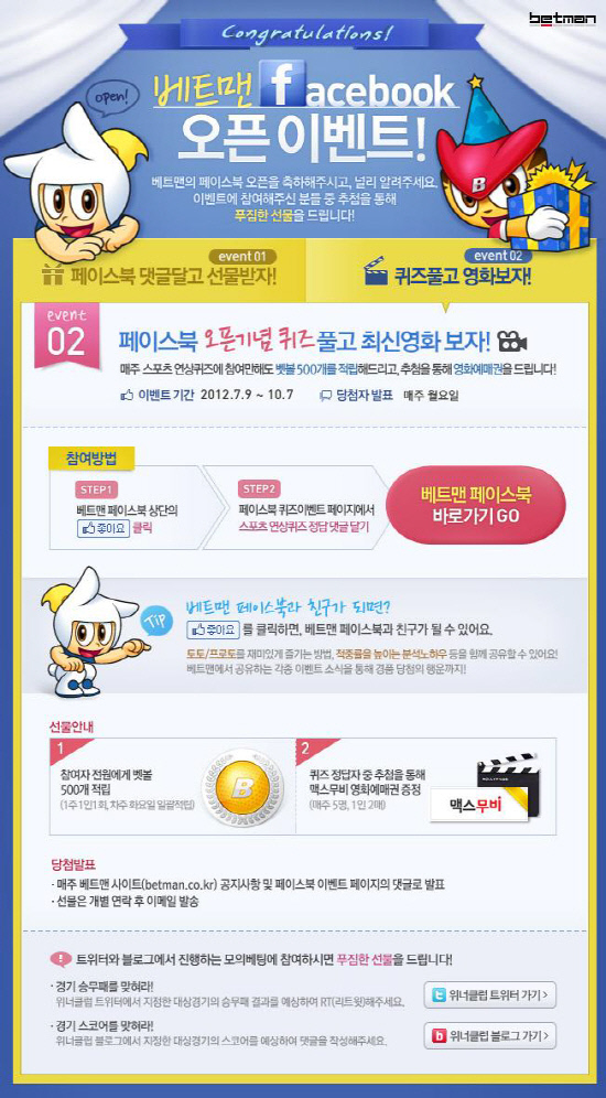 국민체육진흥공단(www.kspo.or.kr)이 발행하는 체육진흥투표권 수탁사업자인 스포츠토토 공식 온라인 발매 사이트인 베트맨(www.betman.co.kr)이 '베트맨 페이스북 오픈 이벤트'를 실시중이다.