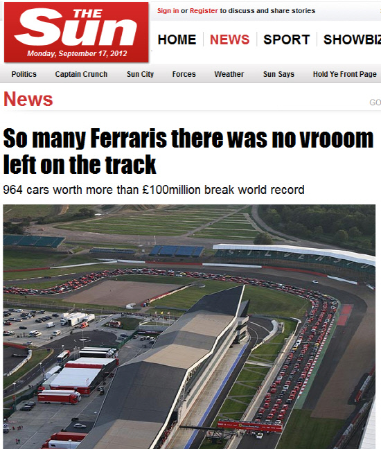 15일 영국 실버스톤 서킷에서 열린 '페라리 레이싱 데이즈' 행사에서 964대의 페라리가 한 트랙에서 퍼레이드를 벌이며, 2004년 일본 수주카 서킷의 490대 기록의 두 배에 달하는 기네스 기록을 세웠다.