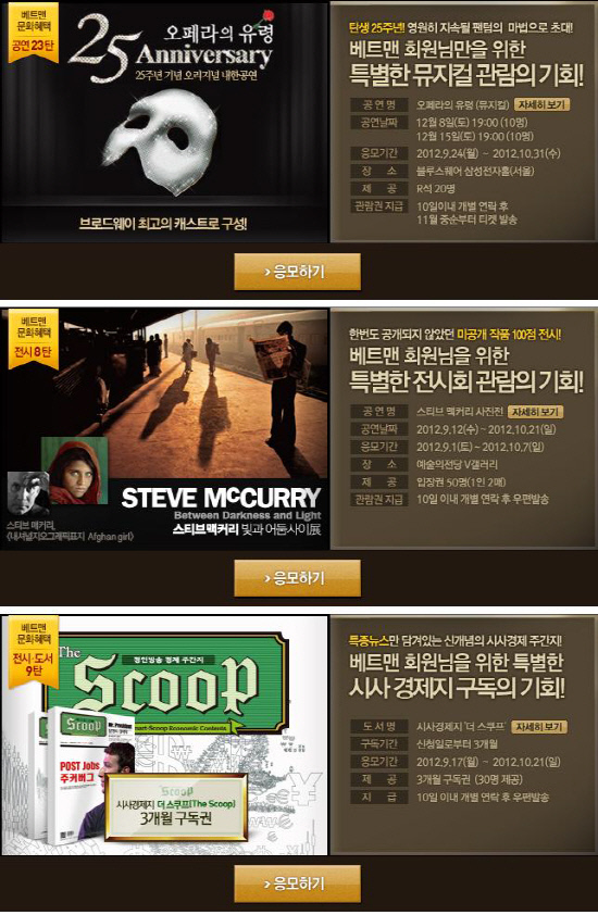 먼저 베트맨 문화혜택 중 공연 23탄은 블루스퀘어 삼성전자홀에서 열리고 있는 뮤지컬 오페라의 유령의 관람기회를 제공한다. 가장 인기 있는 뮤지컬 중 하나인 '오페라의 유령'은 브로드웨이 최고의 캐스트로 구성된 25주년 기념 오리지널 내한공연으로 관객들의 큰 호응을 얻고 있다. 벳볼 300개 이상을 보유한 회원은 오는 10월31일까지 응모가 가능하며, 추첨을 통해 선정된 20명에게 R석 관람권을 제공한다.