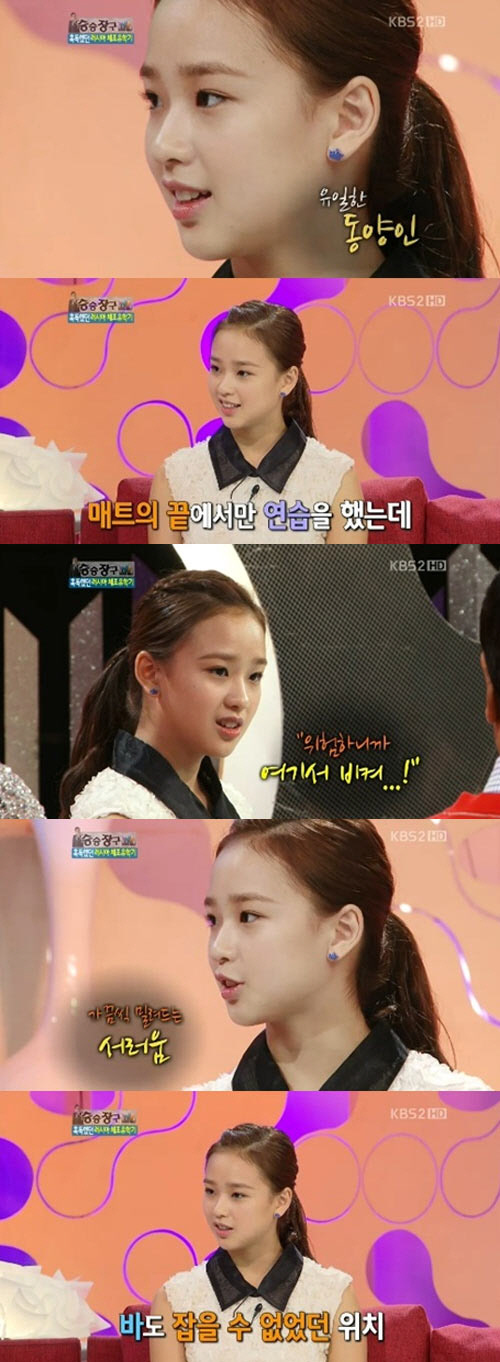 이에 MC 김승우가 "러시아에서 텃세는 없었느냐"고 묻자 손연재는 "처음에 갔을 때는 매트가 별로 없어서 러시아 선수들이 연습할 동안 나는 끝에서만 연습을 했다. 그런데 그 친구들이 위험하니까 비키라고 했다. 그래서 결국 매트 밖으로 나가 있다가 다시 매트 끝으로 들어오곤 했다"고 밝혔다.