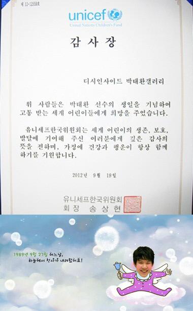 박태환 팬클럽인 '디시인사이드 박태환 갤러리'는 27일 박태환의 스물네번째 생일을 맞아 가장 뜻깊은 선물을 고민했다. 물 부족으로 허덕이는 아프리카에 60만원 상당의 펌프를 기부하기로 뜻을 모았다. 유니세프 담당자와 통화하며 가장 좋은 방법을 모색했다. 19일 기부금을 전달한 후 유니세프로부터 감사장을 받았다. 이들의 정성은 '박태환갤러리'의 이름으로 전세계 어린이 구호활동에 쓰이게 된다. 박태환 팬 이름으로 된 유니세프의 감사장을 박태환에게 선물할 생각이다. '위 사람들은 박태환 선수의 생일을 기념하여 고통받는 세계 어린이들에게 희망을 주었습니다. 유니세프한국위원회는 세계 어린이의 생존, 보호, 발달에 기여해주신 여러분에게 깊은 감사의 뜻을 전하며, 가정에 건강과 행운이 항상 함께하기를 기원합니다'라는 글귀가 써있다. 팬들은 온라인 사이트에 '감사장 인증샷'을 올리며 박태환의 생일을 축하했다.