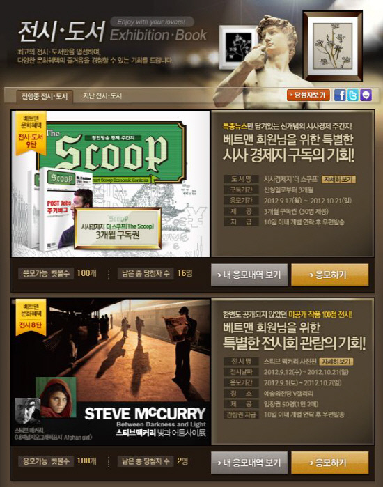국민체육진흥공단(www.kspo.or.kr)이 발행하는 체육진흥투표권 수탁사업자인 스포츠토토의 공식 온라인 발매 사이트 베트맨(www.betman.co.kr)이 다큐사진의 대가 스키브맥커리의 사진전 입장권 을 증정하는 컬쳐라운지 전시 이벤트 8탄과 시사경제지 '더스쿠프' 3개월 구독권을 증정하는 전시·도서 이벤트 9탄이 스포츠토토 팬들로부터 뜨거운 호응을 얻고 있다.전시 이벤트 8탄 스티브 맥커리 '빛과 어둠사이' 사진전은 서울 예술의 전당 V갤러리에서 열리고 있으며 21일까지 진행한다. 스티브맥커리는 World Photographers 대상을 네 번이나 수상하고, 사진의 노벨상이라 불리는 Oliver Rebbot Memorial Award를 두 번씩이나 수상한 자타가 공인하는 사진계의 거장이다. 특히 이번 사진전의 주제 '빛과 어둠사이'라는 제목에서 알 수 있듯이 테크닉이나 인위적 장식을 쓰지 않고도 빛과 어둠만으로 예술성과 휴머니티를 절묘하게 표현해낸 주옥 같은 사진 100여점이 이번 사진전에서 소개된다. 7일까지 진행되는 전시 이벤트 8탄은 벳볼 100개 이상을 보유한 베트맨 회원은 누구나 응모가 가능하다. 추첨을 통해 선정된 50명에게는 사진전 입장권(1인 2매)가 제공된다.