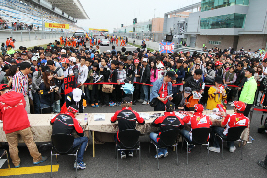 ◇13일 F1 코리아 그랑프리 예선이 끝난 후 진행된 사인회에서 페르난도 알론소, 펠리페 마사 등 5명의 드라이버들이 F1 팬들에게 사인을 해주고 있다. 사진제공=F1 조직위원회