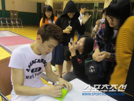 ◇'훈남 검객''구본길이 대구 정화여고에서 열린 전국체전 남자 일반부 펜싱 사브르 단체전 경기 직후 소녀팬들의 사인, 사진촬영 요청에 응하고 있다.