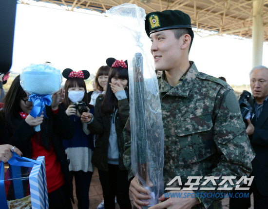 '마린보이' 박태환이 31일 논산 훈련소에서 4주간의 군사훈련을 무사히 마치고 퇴소했다. 박태환이 디시인사이드 박태환 갤러리 팬들이 준비한 선물을 받고 있다. 논산=전준엽 기자 noodle@sportschosun.com
