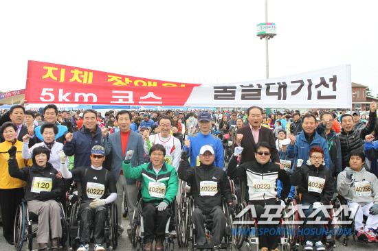 | ◇4일 충남전국어울림마라톤대회 5km종목에 참가한 김용환 문화체육관광부 제2차관과 손진호 대한장애인체육회 사무총장 진태구 태안군수 등이 장애인 참가자들과 스타트 직전 파이팅을_외치고_있다. |