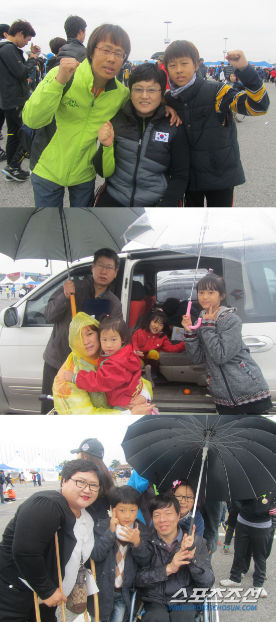| ◇충남어울림마라톤은 장애인 가족들의 행복한 축제였다. 온가족이 함께 달리며 서로를 응원했다. 위쪽부터 지체장애 5km 마라톤에 출전한 안경희씨 가족, 전날 함께 1박2일 마라톤 테마여행에 나선 김형자씨 가족과 박혜경씨 가족. |