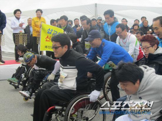 | ◇4일 충남어울림마라톤에서 김용환 문체부 차관이 휠체어를 힘차게 밀며 출발하고 있다. |