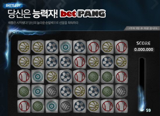 이벤트 참가자들에게는 추첨을 통해 삼성전자 LED TV(1명), LG전자 휘센 가습기(1명), CGV 3D 영화예매권(10명), 벳머니 1만원권(20명) 등을 나눠준다. 또 매주 한차례씩 추첨을 통해 신세계상품권 5만원권(1명), 스타벅스 기프티콘(10명), 벳머니 1000원(50명), 벳볼 3만개(300명)등을 추가로 지급한다.