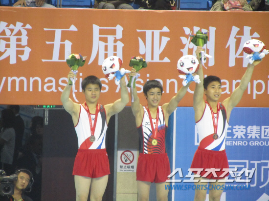 ◇아시아선수권에서 10대 파워를 선보였다. 13일 중국 푸톈에서 열린 제5회 아시아체조선수권 남자개인전 마루 종목 결승에서 김한솔과 이준호가 나란히 은-동메달을 목에 걸었다. 왼쪽부터 은메달리스트 김한솔, 금메달리스트 일본의 시라이 겐조 , 동메달리스트 이준호.