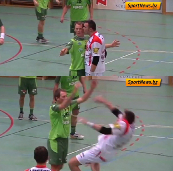 핸드볼 경기 중 공격수가 상대 수비수에게 키스를 해 황당한 몸싸움이 일어났다.
