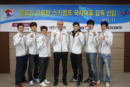 ◇볼프강 하트만 감독이 스키점프 국가대표 선수들과 기념촬영을 하고 있다. 하성조 대표팀 코치, 강칠구, 최서우, 하트만 감독, 최흥철, 박제언, 김현기(왼쪽부터) 파이팅을 외치고 있다. 사진제공=대한스키협회 |