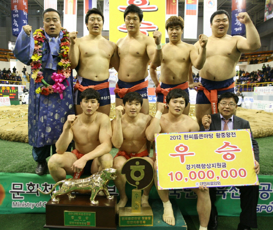 | ◇현대삼호중공업이 27일 전남 영광 스포디움에서 열린 2012년 천하장사 씨름대축제 한씨름큰마당 왕중왕전에서 3년 연속 우승을 차지했다. 현대삼호중공업 씨름단의 모습. 사진제공=대한씨름협회 |