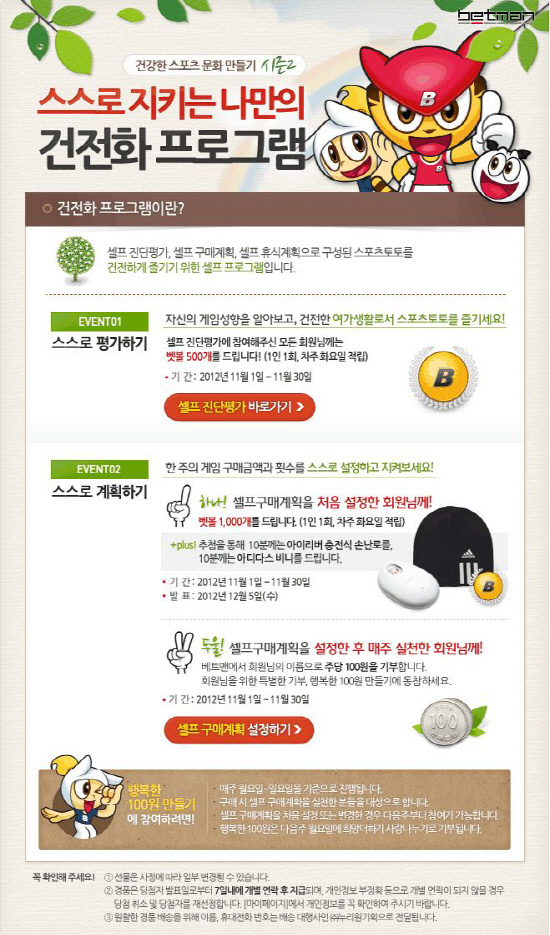 이번 캠페인은 베트맨이 현재 운영중인 셀프진단평가, 셀프구매계획, 셀프휴식계획 등 '스스로 지키는 나만의 건전화 프로그램'을 이용해 보다 건전하게 스포츠토토 게임을 즐길 수 있도록 하기 위해 마련됐다.