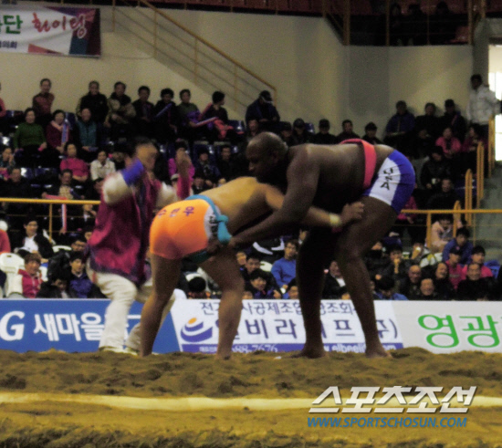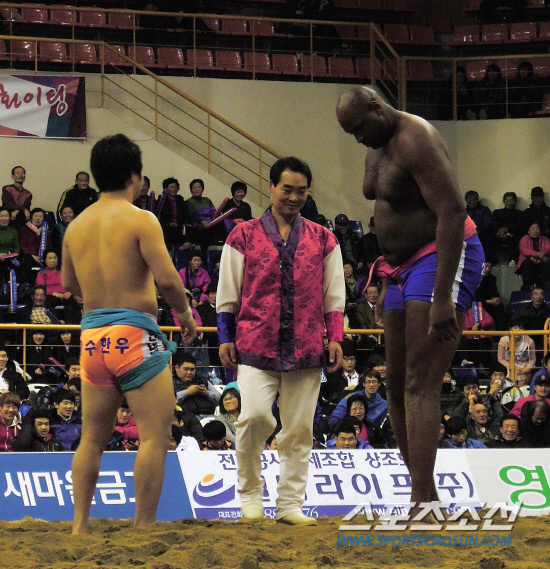 2m33에 달하는 거구의 외국인이 모습을 드러냈다. 그에 비해 한없이 작아 보이는 국내 선수가 모래판에 나란히 오르자 관중들이 탄성을 내질렀다.