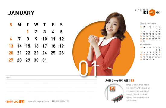 김연아의 이미지로 제작되었으며, 월별로 다양한 의상과 매력을 감상할 수 있다. E1은 오렌지카드 회원을 대상으로 배포한다. 오렌지카드 회원이면 누구나 E1 오렌지카드 홈페이지(www.e1orangecard.com)에서 간단한 배송지 주소 확인 후 신청할 수 있다. E1은 선착순 응모 회원 2만명에게 캘린더를 우편 배송할 예정이다.