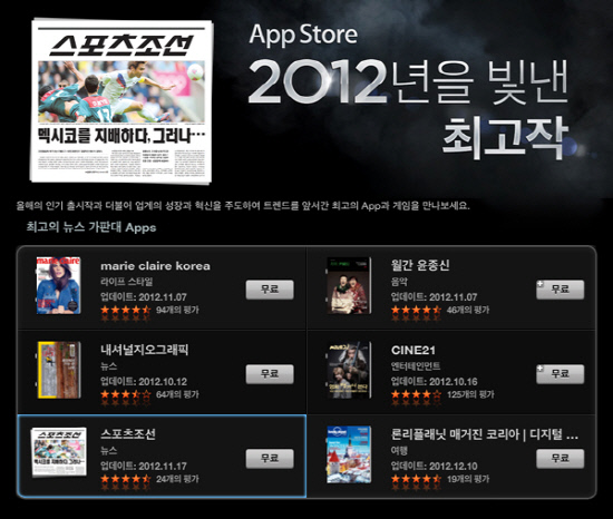 스포츠조선 아이패드앱(이하 스포츠조선 앱)이 '2012년 올해의 앱'에 선정됐다.