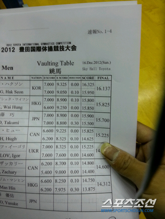 난도 7.4, 세상에 없는 원천기술 '양1'은 아껴뒀다. 난도 7.0의 '여2'를 뛰고도 적수가 없었다. '도마의 신' 양학선(20·한체대)은 그렇게 우월했다.
