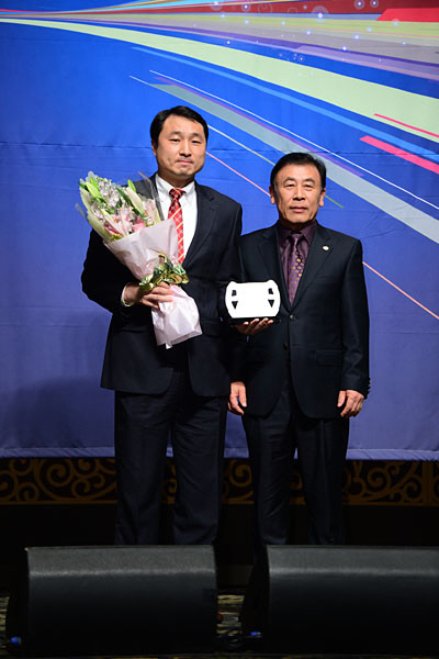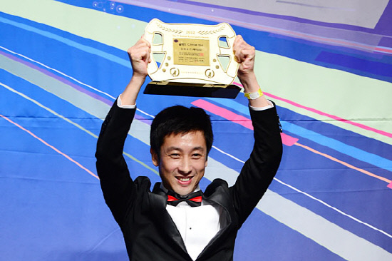 17일 서울 양재동 엘타워 그랜드홀에서 열린 제7회 한국모터스포츠 어워즈 2012에서 CJ레이싱팀 김의수 선수가 올해의 드라이버 대상을 받았다. 최고의 상인 골든 스티어링휠 트로피와 함께 후지필름에서 제공하는 200만원 상당의 디지털카메라 X-E1을 부상으로 받았다. 시상자 한국자동차경주협회 변동식 회장. /사진=지피코리아