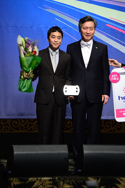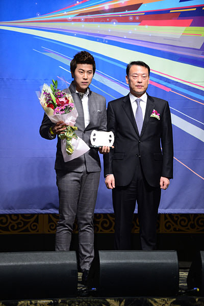 제7회 한국모터스포츠 어워즈 2012 '올해의 에네오스 인기상'과 '올해의 레이싱팀상' 2개부문을 수상한 류시원(EXR팀106) 감독. 시상자 에네오스코리아 장윤범 대표