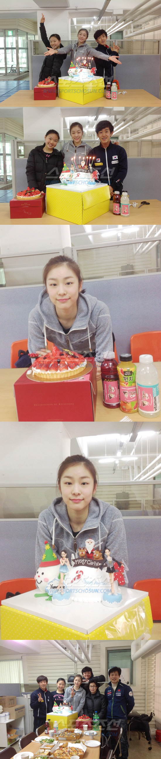 김연아는 자신의 피규어가 놓여 있는 케이크를 앞에 두고 두 손을 펼치고 있는 포즈를 취하고 있다. 후배 김진서와 김해진 역시 손을 위로 뻗거나 손으로 총 모양을 만든 포즈를 취하고 사진을 찍으며 즐거운 한때를 보내고 있는 모습이다.