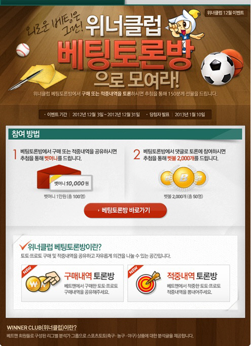 국민체육진흥공단(www.kspo.or.kr)이 발행하는 체육진흥투표권 수탁사업자인 스포츠토토 공식 발매사이트인 베트맨(www.betman.co.kr)가 진행중인 위너클럽 12월 이벤트의 마감이 임박했다.