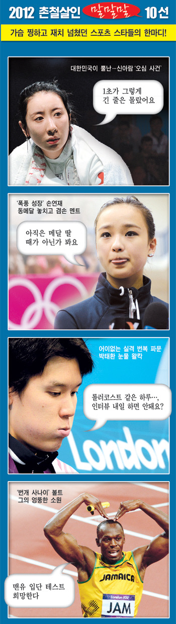 올림픽 열기가 잦아든 후 스포츠계 최대 이슈는 '월드 배구스타' 김연경의 '터키 이적' 문제였다. 선수와 소속팀의 진실공방, 갑론을박에 팬들의 찬반양론도 요란했다. 정부가 직접 중재에 나섰다. '피겨여제' 김연아의 귀환엔 전세계가 들떴다. 2년만에 돌아온 그녀는 변함없는 높이, 한결같은 클래스로 큰 기쁨을 안겼다. 2012년 아마 스포츠계를 뒤흔들었던 핫이슈, 전국민을 웃기고 울렸던 '촌철살인 말말말 10선'을 뽑았다.
