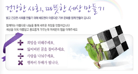 베트맨 관계자는 "올 한해 동안 캠페인에 선뜻 동참해준 베트맨 회원님들의 사랑 덕분에 우리 사회의 어려운 이웃들에게 작은 희망을 선물할 수 있었다"며 "보다 밝고 건강한 사회를 만들기 위해 2013년 새해에도 계속해서 희망더하기 사랑나누기 캠페인을 전개할 예정"이라고 밝혔다.