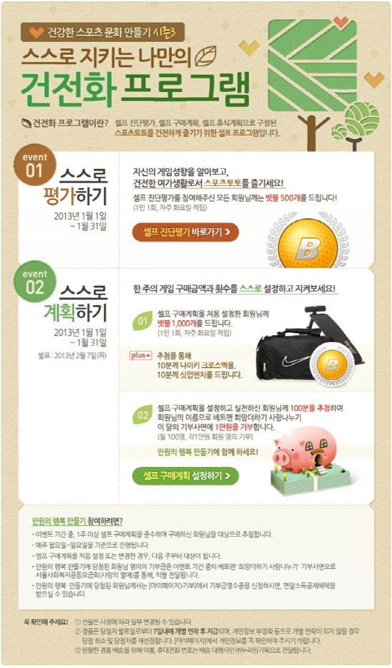이밖에 셀프 구매계획을 설정하고 실천한 회원들을 대상으로 100명을 추첨해 그 회원의 이름으로 베트맨에서 진행하고 있는 기부프로그램 '희망더하기 사랑 나누기'에 1만원을 기부하는 등 건전한 스포츠문화 만들기에 동참하는 것뿐만 아니라 이웃 나눔에 까지 참여할 수 있는 좋은 기회가 될 예정이다.