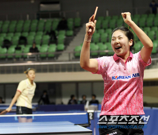 대한항공 박성혜가 마지막 세트에서 포스코에너지 윤선애를 3-1로 꺾고 우승이 확정된 순간, 두손을 치켜올리며 환호하고 있다. 사진제공=월간탁구 안성호 기자